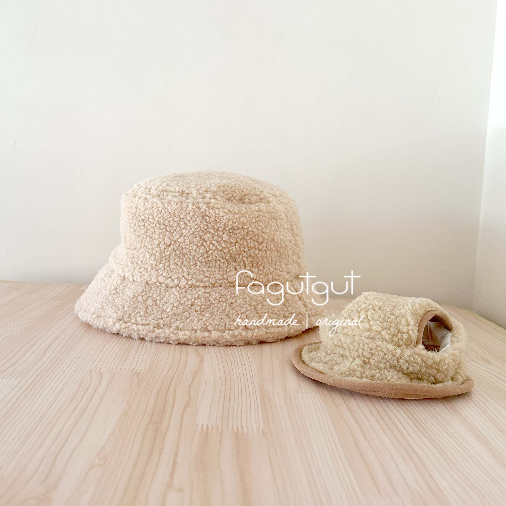 fagutgut 花吉吉手作 - 手工羊羔絨漁夫帽(可配人寵親子裝) - 平頂款 - 可調節 - 牛奶曲奇色 (嬰兒/兒童/成人)
