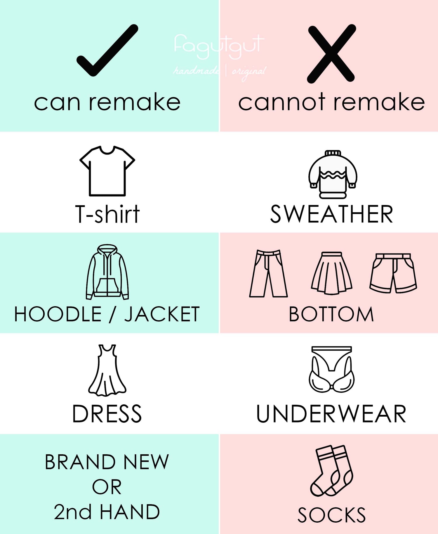 1. 每個款式最好提供2件舊衣物,以達最佳效果。
